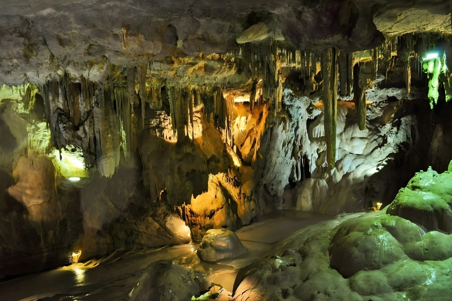 - La première grotte dévoile un décor féérique : stalactites élancées, stalagmites massives, piliers majestueux, et une forêt minérale sculptée par l’érosion,