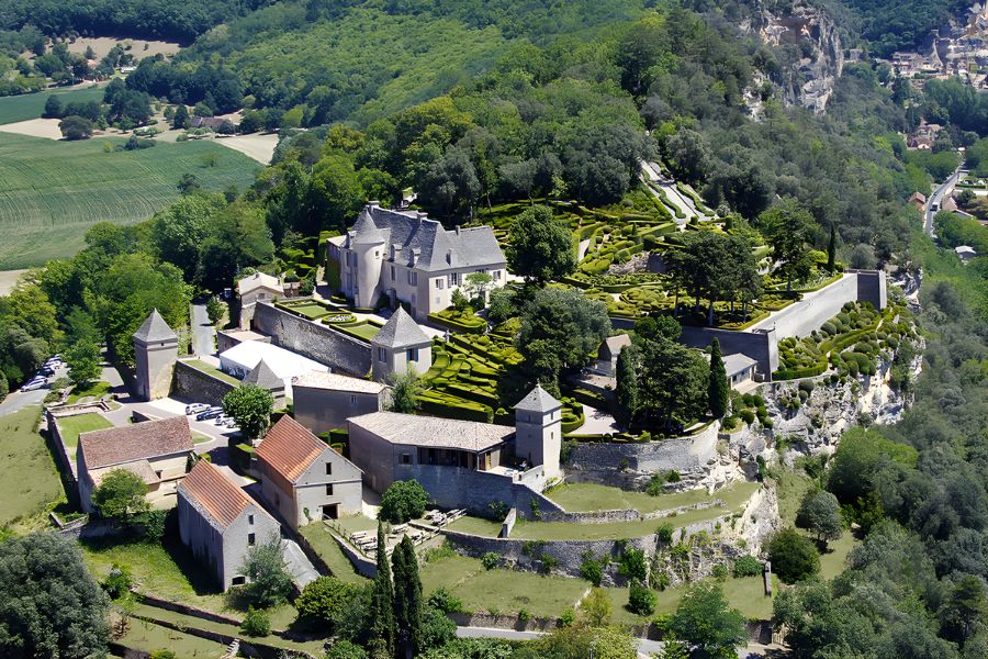 Aménagé sur un éperon rocheux, le domaine domine la vallée depuis ses falaises calcaires et déroule une promenade élégante, presque hors du temps, autour d’un château couvert de lauzes.